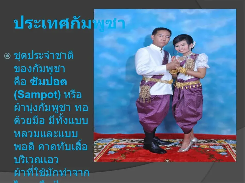 3. ชุดซัมปอตเป็นชุดประจำชาติสยามที่ชาวกัมพูชายึดถือกันมายาวนาน เป็นผ้าผืนสี่เหลี่ยม ม้วนเป็นลอนรอบเอวและพับเก็บจากด้านหน้าไปด้านหลังระหว่างขากางเกง