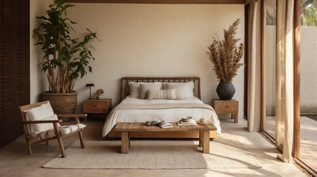 ตกแต่งด้วยวัสดุธรรมชาติ เช่น ผ้าฝ้าย ผ้าลินิน เครื่องปั้นดินเผา หรือหิน