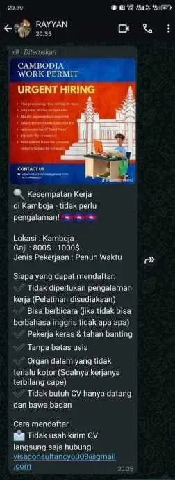 โฆษณาที่เขียนเป็นภาษามาเลย์กลายเป็นไวรัลบนแพลตฟอร์มโซเชียลมีเดีย Threads เนื้อหาระบุว่าสถานที่ทำงานอยู่ที่กัมพูชา เงินเดือนรายเดือนสูงถึง 1,000 ดอลลาร์สหรัฐ (ประมาณ 33,000 บาท) และไม่จำเป็นต้องมีวุฒิการศึกษาหรือประสบการณ์การทำงาน เงื่อนไขดูจะไม่มีอะไรยากและน่าดึงดูด อย่างไรก็ตาม มีเงื่อนไขข้อหนึ่งระบุว่า “ต้องมีอวัยวะภายในที่สะอาด” ซึ่งเป็นเรื่องที่น่าสงสัย