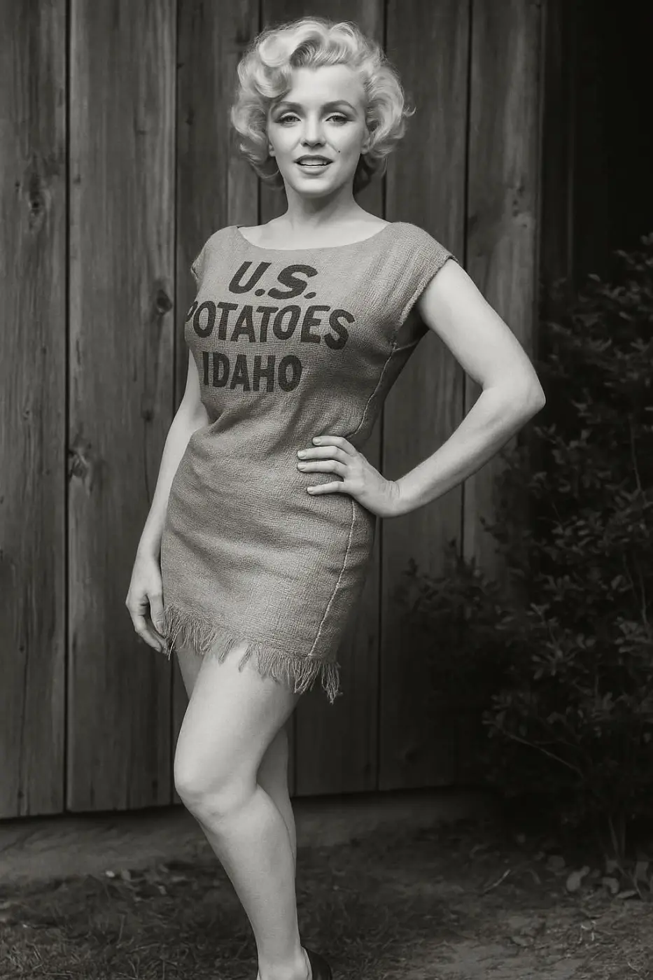 ร่วมกับช่างภาพ Earl Theisen ในนิตยสาร Photoplay มาริลินถ่ายภาพแฟชั่นเซตสุดท้าทาย โดยสวม “ชุดกระสอบมันฝรั่ง” ที่ตัดเย็บเข้ารูปเผยสัดส่วนอย่างมีศิลป์ จับคู่กับรองเท้าส้นสูงและลิปสติกแดงฉ่ำ เธอยืนโพสอย่างมั่นใจ ส่งสารถึงทุกคนว่า “แม้แต่กระสอบ ก็ไม่อาจลดทอนเสน่ห์ของฉันได้”
