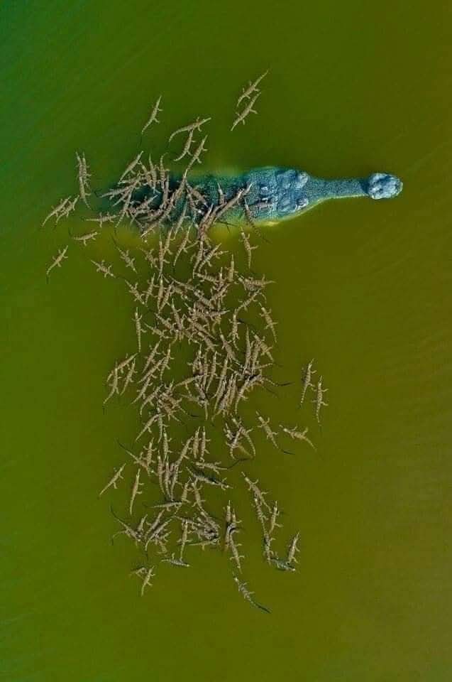 ตะโขงอินเดีย (Gavialis gangeticus) เป็นสัตว์เลื้อยคลานที่ใกล้สูญพันธุ์อย่างยิ่ง มีจุดเด่นที่ปากเรียวยาวเหมาะสำหรับจับปลา และ “โหนกกลม” ที่ปลายจมูกของตัวผู้ซึ่งทำหน้าที่ขยายเสียงเพื่อสื่อสาร — ภาพถ่ายนี้จึงไม่เพียงแต่งดงามในเชิงศิลปะ แต่ยังสื่อถึงความลึกซึ้งของพฤติกรรมพ่อ-ลูกในธรรมชาติอีกด้วย