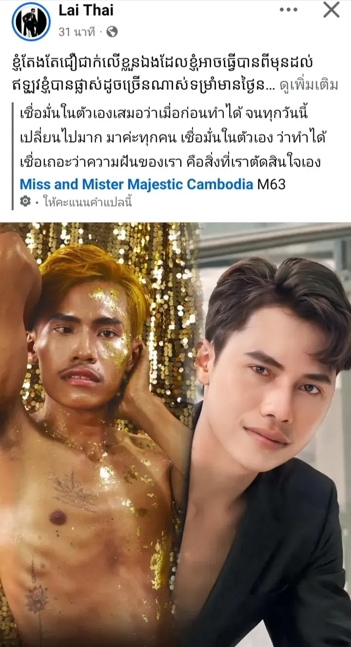 ลายไทย Laithai หนุ่มนายแบบคนดังจากเวทีประกวดมิสเตอร์มาจิสติกส์ cambodia 2025 หมายเลข m 63 ล่าสุดเขาได้โพสต์ภาพเปรียบเทียบอดีตและหลังก่อนที่เขายังไม่หล่อเหมือนในปัจจุบัน และได้โพสต์สร้างแรงบันดาลใจให้กับทุกคน ให้ลุกขึ้นมาสู้และมีความฝัน เชื่อมั่นในตัวเอง ว่าทำได้