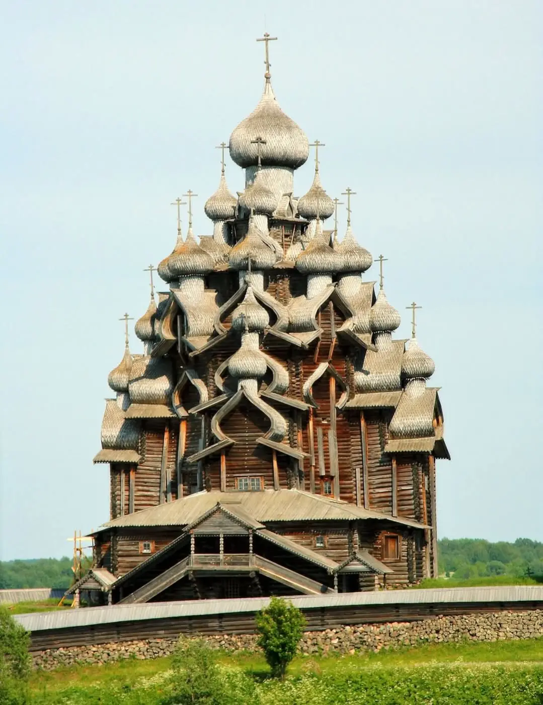สร้างขึ้นในปี 1714 โบสถ์แห่งนี้ถือเป็นสุดยอดผลงานของภูมิปัญญาช่างไม้พื้นบ้านรัสเซีย โดยใช้เทคนิคการเข้าลิ่มไม้แบบดั้งเดิมโดยแทบ ไม่ใช้ตะปูแม้แต่ตัวเดียวในโครงสร้างหลัก ถือเป็นตัวอย่างอันงดงามของความสามารถในการก่อสร้างด้วยไม้ของมนุษย์ในยุคก่อนอุตสาหกรรม