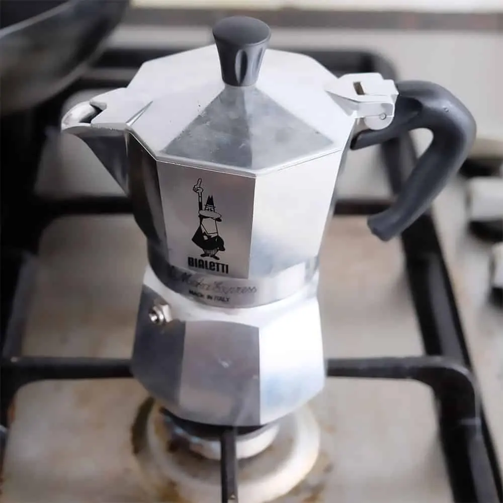 4. เมื่อไอน้ำเริ่มออกมาจากปลายท่อ ให้ยก Moka Pot ออกจากเตาและหรี่ไฟลง