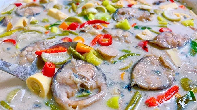 2. ใส่เนื้อปลาดุกลงไป ตามด้วยหน่อไม้ ถั่วฝักยาว มะเขือเปราะ แล้วคนให้เข้ากัน