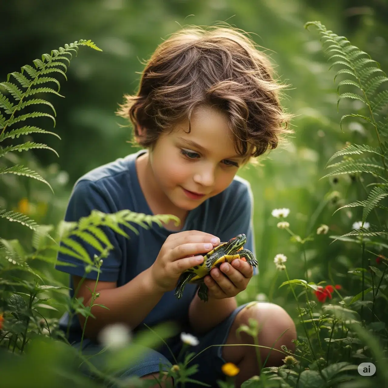 เด็กชายเอานิ้วเขี่ยเบา ๆ เต่าก็หดคอและขาทั้งหมดกลับเข้าไปแน่นกว่าเดิม