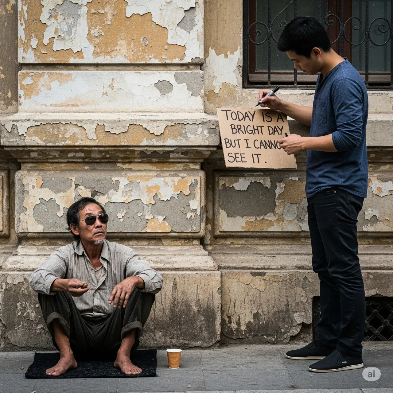 เขาหยุดมองชายชราอยู่ครู่หนึ่ง ก่อนจะหยิบป้ายนั้นขึ้นมา พลิกกลับด้าน แล้วเขียนข้อความใหม่ลงไปอย่างเงียบงัน