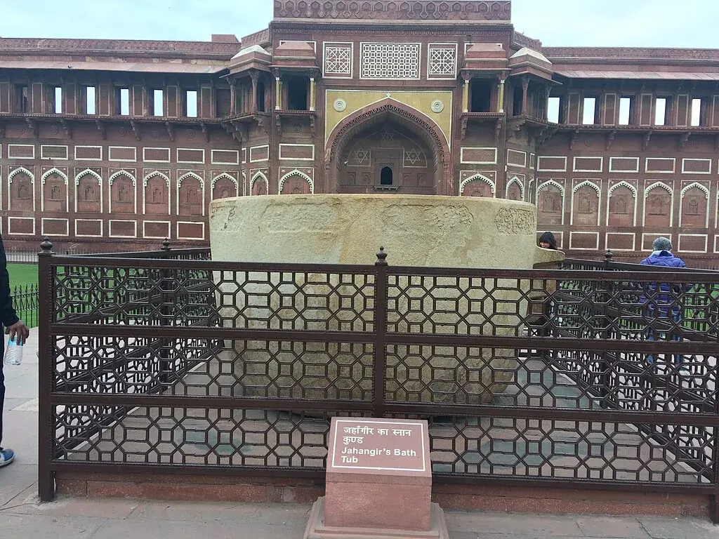 **ถังน้ำของชะฮังคีร์ (Jahangir's Hauz)** (ค.ศ. 1610): ถังน้ำขนาดใหญ่ที่ใช้สำหรับอาบน้ำ สร้างจากหินก้อนเดียว มีความสูง 5 ฟุต เส้นผ่านศูนย์กลาง 8 ฟุต และเส้นรอบวง 25 ฟุต มีจารึกภาษาเปอร์เซียบนขอบถัง ระบุชื่อว่า "Hauz-e-Jahangir" เดิมตั้งอยู่ใกล้ลานพระราชวังของพระเจ้าอัคบาร์ ต่อมาในปี 1843 ได้ย้ายมาไว้หน้า "Diwan-e-Am" และในปี 1862 ถูกย้ายไปสวนสาธารณะ "Company Bagh" ซึ่งทำให้ได้รับความเสียหาย ภายหลัง Sir John Marshall ได้นำกลับมายังป้อมอัคราอีกครั้ง เนื่องจากถังน้ำนี้ พระราชวังจึงได้รับชื่อว่า "Jahangiri Mahal" แม้ว่าจะเป็นส่วนหนึ่งของ Bengali Mahal ของพระเจ้าอัคบาร์
