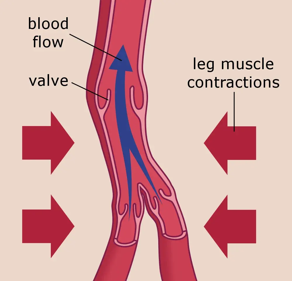 2. การหดตัวของกล้ามเนื้อโครงร่าง (Skeletal muscle pump) กล้ามเนื้อที่หดตัวระหว่างการเคลื่อนไหว เช่น เดิน วิ่ง หรือยืนขยับตัว จะบีบหลอดเลือดดำ แรงบีบนี้จะดันเลือดให้ไหลไปทางหัวใจ ลิ้นในหลอดเลือดจะกันไม่ให้ไหลย้อนลง