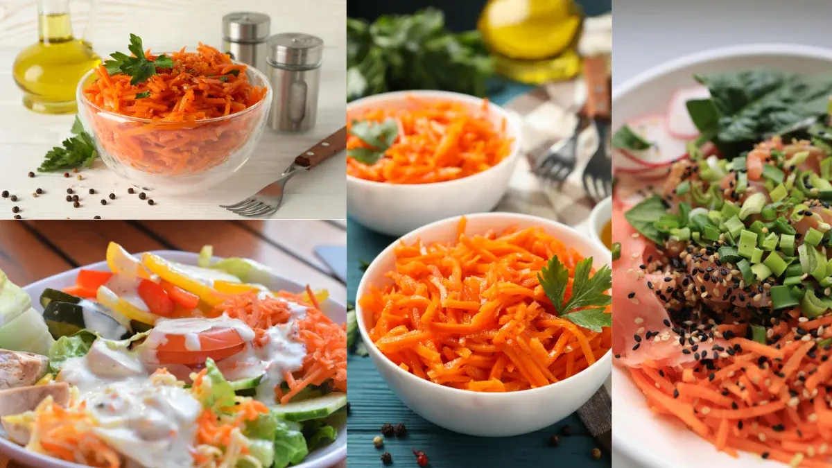 2.สลัดแครอท แครอทมีวิตามินบำรุงสายตาอย่างวิตามินเอ วิตามินซี เบต้าแคโรทีน ยังมีไฟเบอร์ช่วยร่างกายดูแลเรื่องการขับถ่าย สลัดแครอทใช้ส่วนผสมเพียง แครอทขูด ธัญพืชอย่างเมล็ดฟักทอง เมล็ดทานตะวัน ถั่ว และเบอร์รี่อย่างแครนเบอร์รี่แห้ง เชอร์รี่ ลูกเกด น้ำสลัดทำจากน้ำส้มเข้มข้นผสมน้ำมะนาว น้ำมันมะกอก ขมิ้นบด พริกเล็กน้อยพร้อมเกลือ พริกไทย หรือ น้ำสลัดที่ชอบก็ได้เช่นกัน