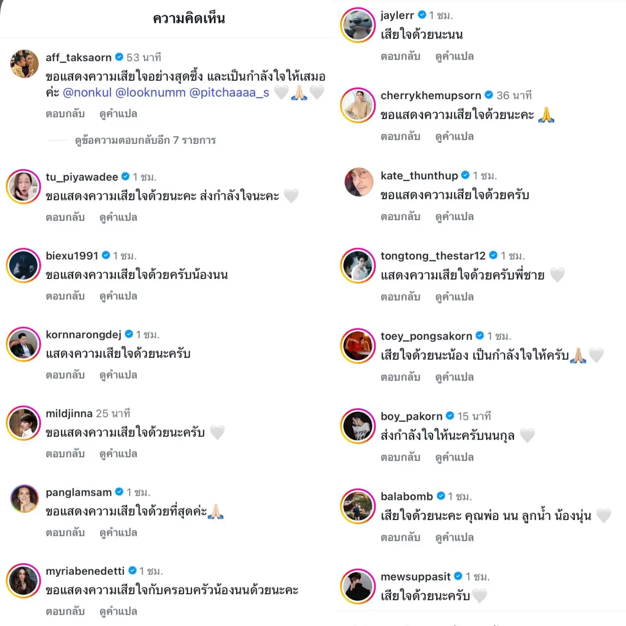 โดยมีเพื่อนพ้องพี่น้องในวงการและแฟนๆ รวมถึง แอฟ ทักษอร คอมเม้นท์แสดงความเสียใจและส่งกำลังใจให้ครอบครัวสันตินธรกุล