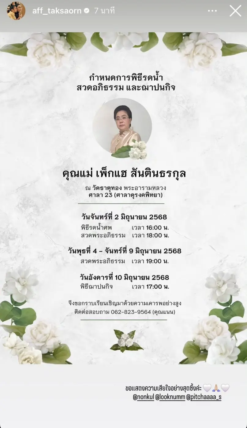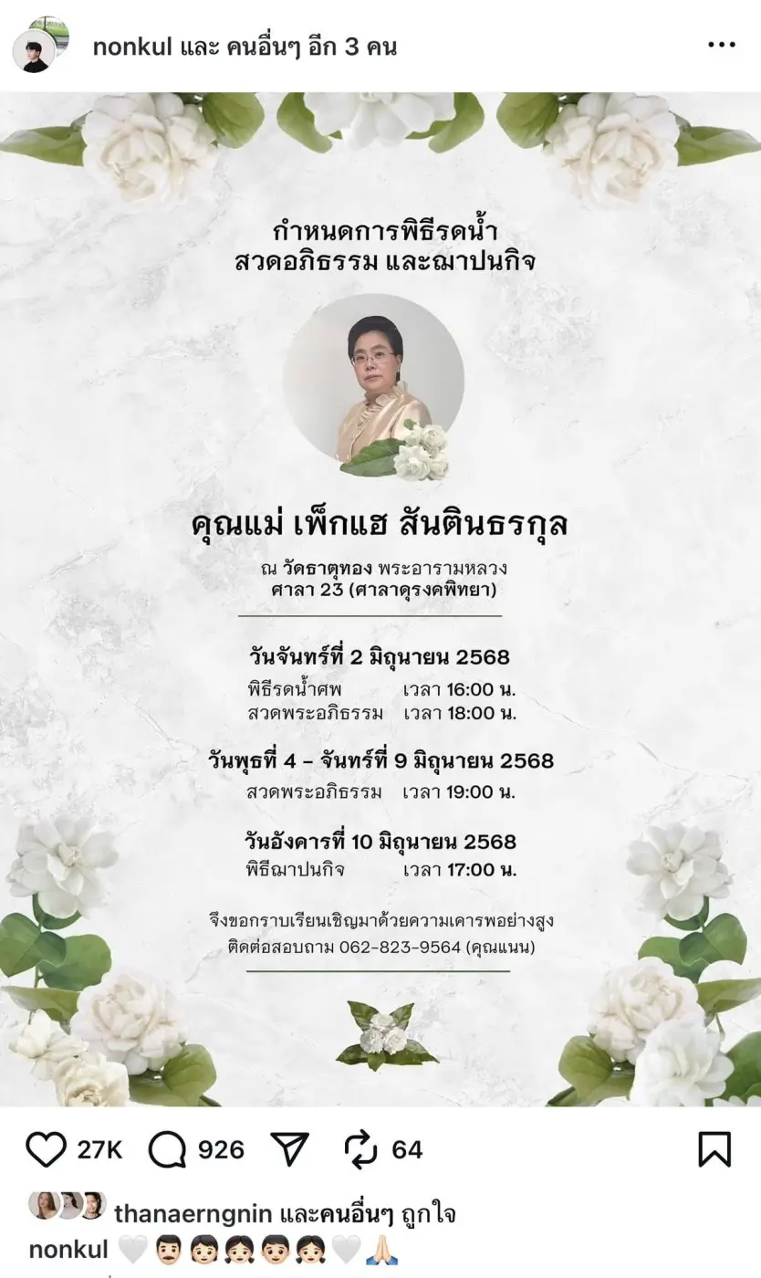 เป็นความสูญเสียครั้งยิ่งใหญ่ของพระเอกหนุ่ม นนกุล ชานน สันตินธรกุล โพสต์แจ้งข่าวเศร้าสูญเสีย คุณแม่เพ็กแฮ สันตินธรกุล พร้อมแจ้งกำหนดการพิธีรดน้ำ สวดอภิธรรมและฌาปนกิจ ณ วัดธาตุทอง ศาลา 23