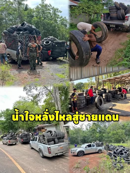 ตามติดสถานการณ์ไทย-กัมพูชา : น้ำใจชาวอุบลราชธานี ร่วมใจกันขนยางรถยนต์ไปให้ทหารตระเวนชายแดน ใช้ทำบังเกอร์ ป้องกันภัย