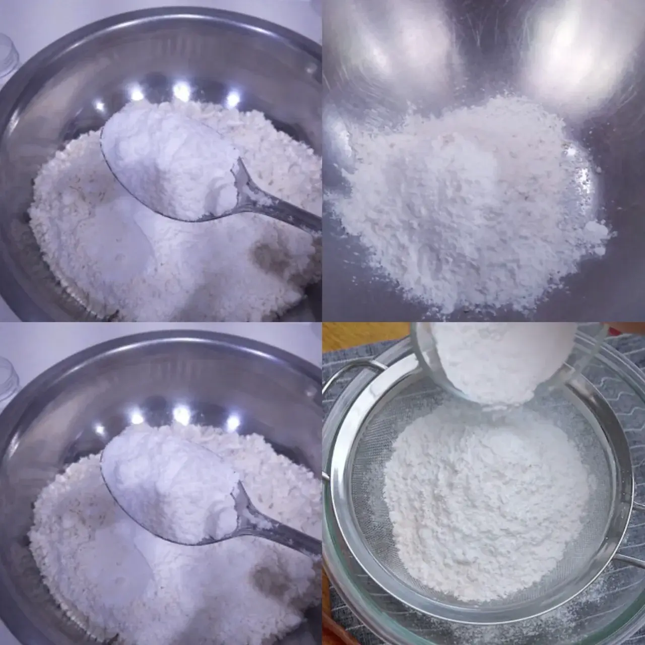 1. ผสมแป้งข้าวเจ้า แป้งสาลี ข้าวโพดป่น ผงฟู เกลือ พริกไทย ให้เข้ากันในชามผสม