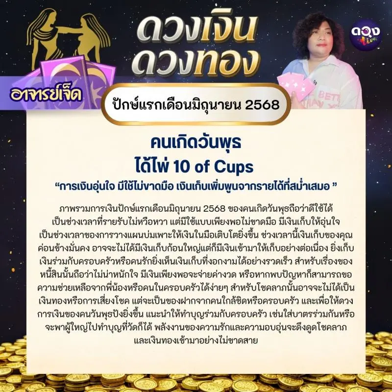 คนเกิดวันพุธ ได้ไพ่ 10 of Cups - “การเงินอุ่นใจ มีใช้ไม่ขาดมือ เงินเก็บเพิ่มพูนจากรายได้ที่สม่ำเสมอ ”