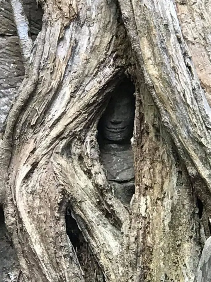 มีอะไรแอบมองเราอยู่ ลองหันหลังดู ในมุมเล็กๆ ลอดช่องออกมาแน่นอนเลย พระพุทธรูปที่คงเหลือเพียงใบหน้าและดวงตาที่พอจะมองเห็น ต้นไม้รู้ได้ยังไงว่าต้องเว้นช่องไว้ ทำให้เป็นที่น่าสนใจของนักท่องเที่ยวมาก