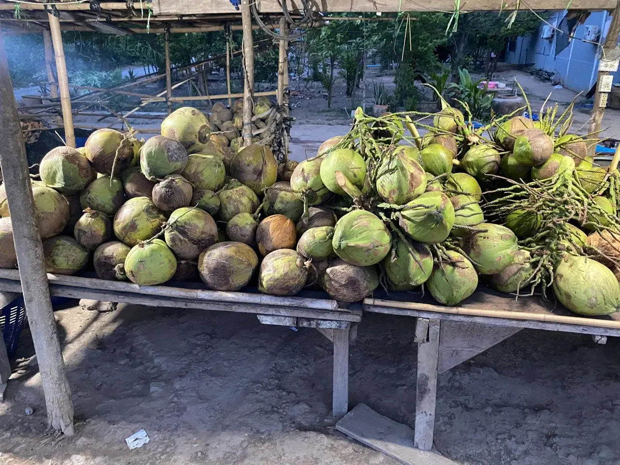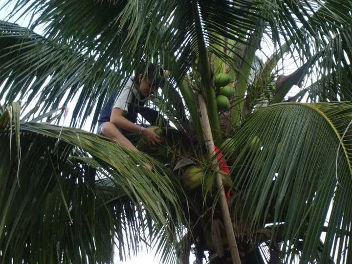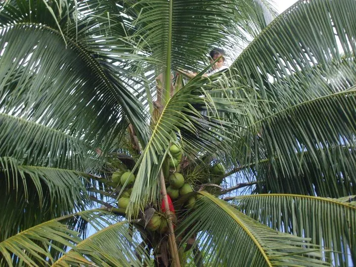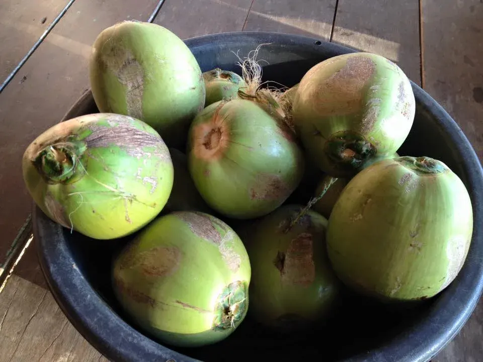 ภาพหลังจากที่เก็บมะพร้าวแล้วนำมาวางกองไว้ กินได้ทั้งหมู่บ้าน เยอะมาก จริงๆ แล้วเคยอ่านในหนังสือเขาบอกว่าการทานน้ำมะพร้าวนั้นดีต่อสุขภาพของเราแต่จะต้องไม่มีการปรุงแต่งอะไร ทานแบบธรรมชาติสามารถที่จะทานแทนการดื่มน้ำได้เลย เพราะว่าน้ำมะพร้าวจะช่วยในการต่อต้านอนุมูลอิสระของเราด้วย ป้องกันโรคหลายอย่าง เพราะว่าครั้งหนึ่งเคยไม่สบายไข้อ่อนๆ ไม่ทานยาแต่ทานน้ำมะพร้าวเพื่อที่จะระบายความร้อน ไม่นานกายก็กลับมาในอุณหภูมิที่ปกติ
