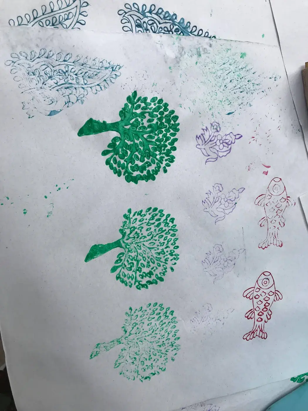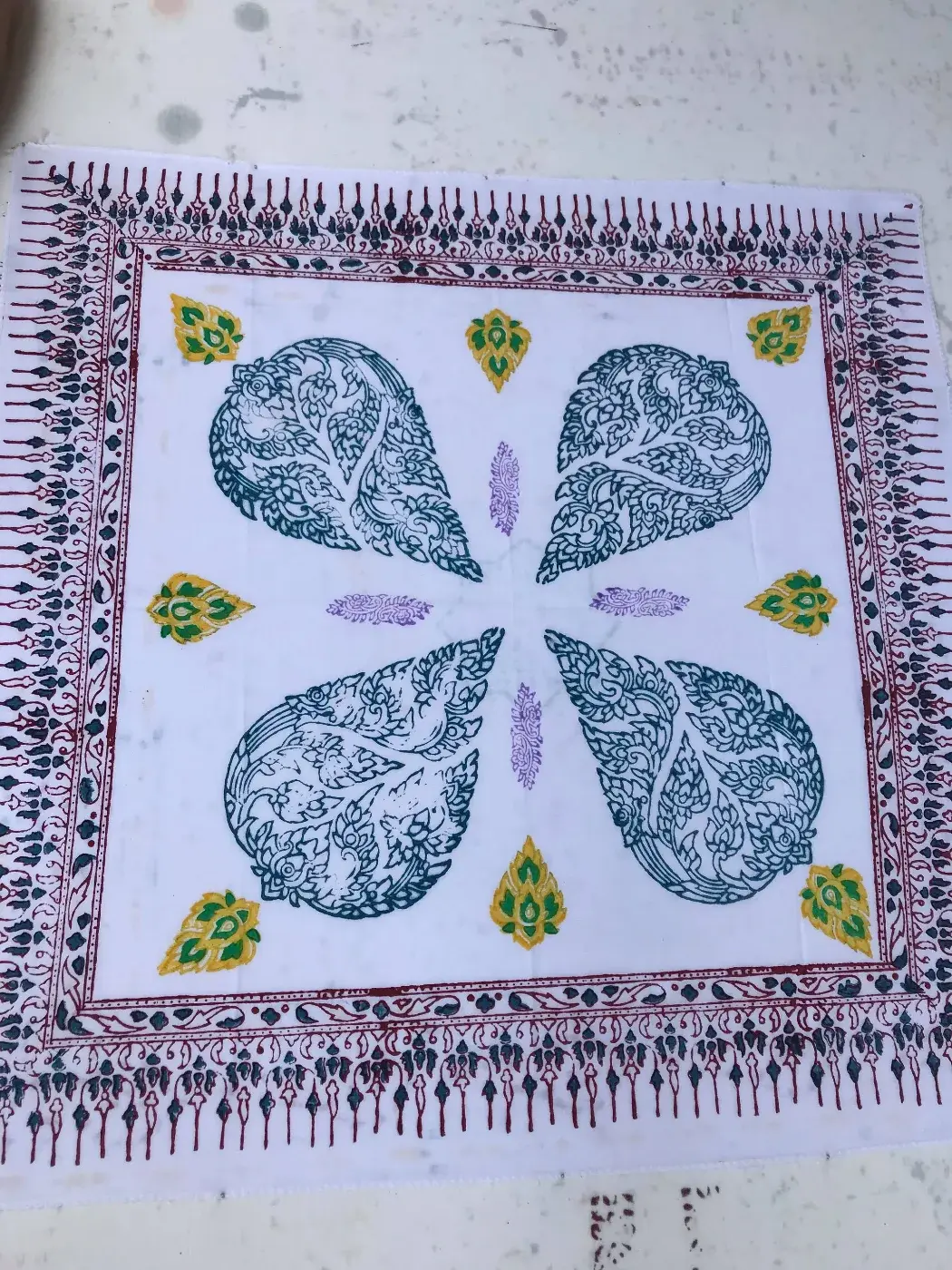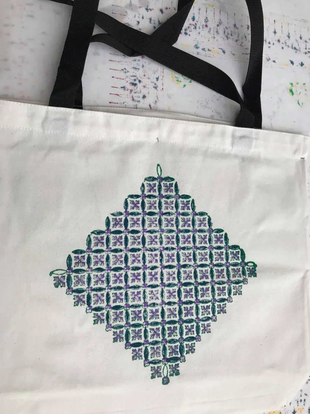มองดูด้านบน หากว่าเราจะประทับ ใส่ในกระเป๋าผ้าจะสวยและเป็นเอกลักษณ์ สิ่งเหล่านี้หากว่าเรานั้นทำจะมีเพียงชิ้นเดียวเท่านั้นเพราะว่าในประเทศเราไม่ค่อยมีลายนี้ เราจะต่อไปด้านไหนได้หมด ตามใจชอบ