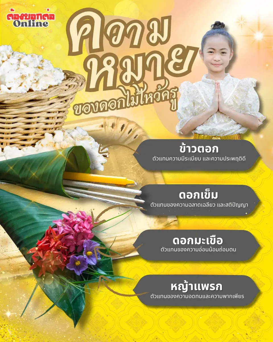 ความหมายของดอกไม้ไหว้ครู : ข้าวตอก ดอกเข็ม ดอกมะเขือ และหญ้าแพรก ที่เรานำไปไหว้ครูกันมีความหมายอย่างไร? สวัสดีค่ะทุกคน วันนี้ขอมาแชร์เรื่องราวเล็กๆ ที่เราอาจเคยชินจนมองข้ามไป นั่นก็คือ "ดอกไม้ไหว้ครู" ในพิธีไหว้ครูของโรงเรียนต่างๆ ทั่วประเทศไทย หลายคนคงเคยได้มีโอกาสจัดพานไหว้ครูด้วยตัวเอง หรือไม่ก็เคยถือพาน หรือถือดอกไม้ไปมอบให้คุณครูสมัยเรียนประถม หรือมัธยม แต่เคยสงสัยไหมคะว่าทำไมเราต้องใส่ดอกไม้บางชนิดลงไปในพานนั้นด้วย ไม่ใช่ว่าจะเลือกดอกไม้แบบไหนก็ได้ตามใจอย่างเดียวนะคะ ดอกไม้แต่ละชนิดที่ถูกจัดลงไปในพานไหว้ครูนั้น ล้วนมีความหมายซ่อนอยู่ วันนี้เราจะมาค่อยๆ แกะความหมายของดอกไม้แต่ละชนิดที่เรานิยมนำไปใช้ในการไหว้ครูกันค่ะ