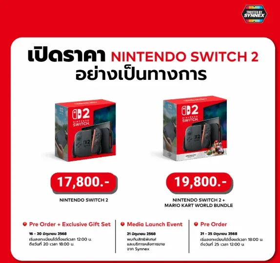 ถ้าใครยังจำได้เมื่อวันก่อนผู้เขียนเคยลงข่าวราคาเครื่อง Nintendo Switch 2 ที่ทาง Synnex Thailand ตัวแทนจำหน่ายเครื่อง Nintendo Switch 2 อย่างเป็นทางการของ Nintendo ได้ออกมาบอกราคาแบบยียวนว่าราคา Nintendo Switch 2 อยู่ที่ 20 ใบเทามีทอน จนหลายคนบ่นว่าจะบอกราคานี้เพื่อทำไมไม่บอกราคาเต็มๆ ไปเลย จนล่าสุดเมื่อวันนี้ทาง Synnex Thailand ก็ประกาศบอกราคามาเสียทีแถมมี 2 รุ่นด้วย นั่นคือราคาเครื่องปกติราคา 17,800 บาท กับเครื่อง Nintendo Switch 2 ที่แถมเกม Mario Kart World Bundle มาด้วย (มาเป็นแผ่นเกมไม่ใช่โค้ด) ราคา 19,800 บาท ราคาจัดว่าไม่ถูกไม่แพงไปเมื่อเทียบกับราคาของญี่ปุ่นกับอเมริกาที่เราเคยบอกไปคราวก่อน หมายเหตุ ข้อมูลและเนื้อหาบางส่วนเอามาจากเพจ เกมถูกบอกด้วย V.2 บน Facebook ส่วนเนื้อหาข่าวเขียนเองทั้งหมด