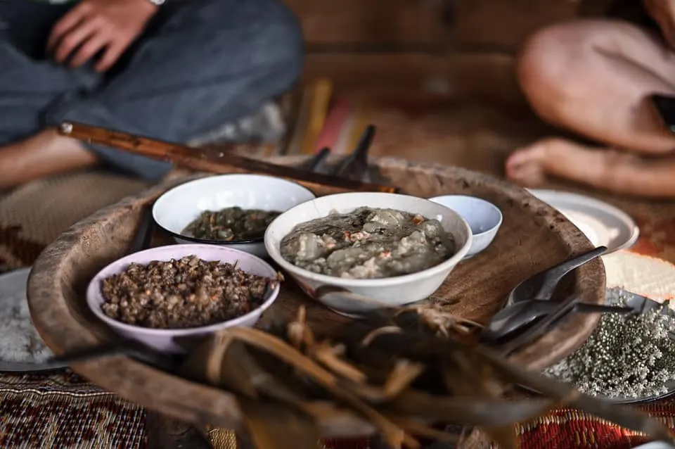 ตอนเช้าก่อนกลับ ผู้เฒ่าทำพิธีผูกแขน นั่งล้อมวงกินข้าวเบ๊อะ ก่อนกลับจากดอยสู่พื้นราบ