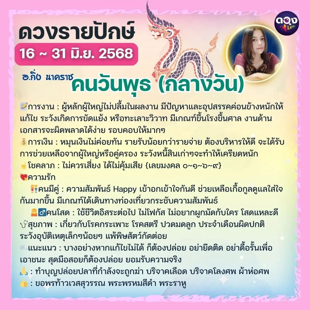 ดวงรายปักษ์วันที่ 16 - 31 มิ.ย. 2568 พยากรณ์โดย อ.กิ่ง นาคราช