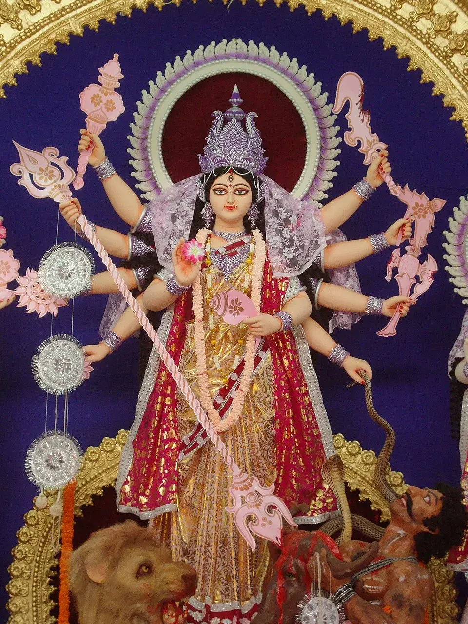 พระองค์ทรงงดงาม มีความเมตตา ทรงฉลองพระองค์ด้วยอาภรณ์หลากสีสันประดับด้วยทองคำอย่างวิจิตร ศาสตราวุธประจำพระองค์คือ ตรีศูลและดาบ ซึ่งเป็นสัญลักษณ์ของการปราบปรามสิ่งชั่วร้ายและความเฉียบขาดในการตัดสิน พระองค์ทรงมีพาหนะเป็นเสือ ซึ่งหมายถึงพลังอำนาจและความยิ่งใหญ่