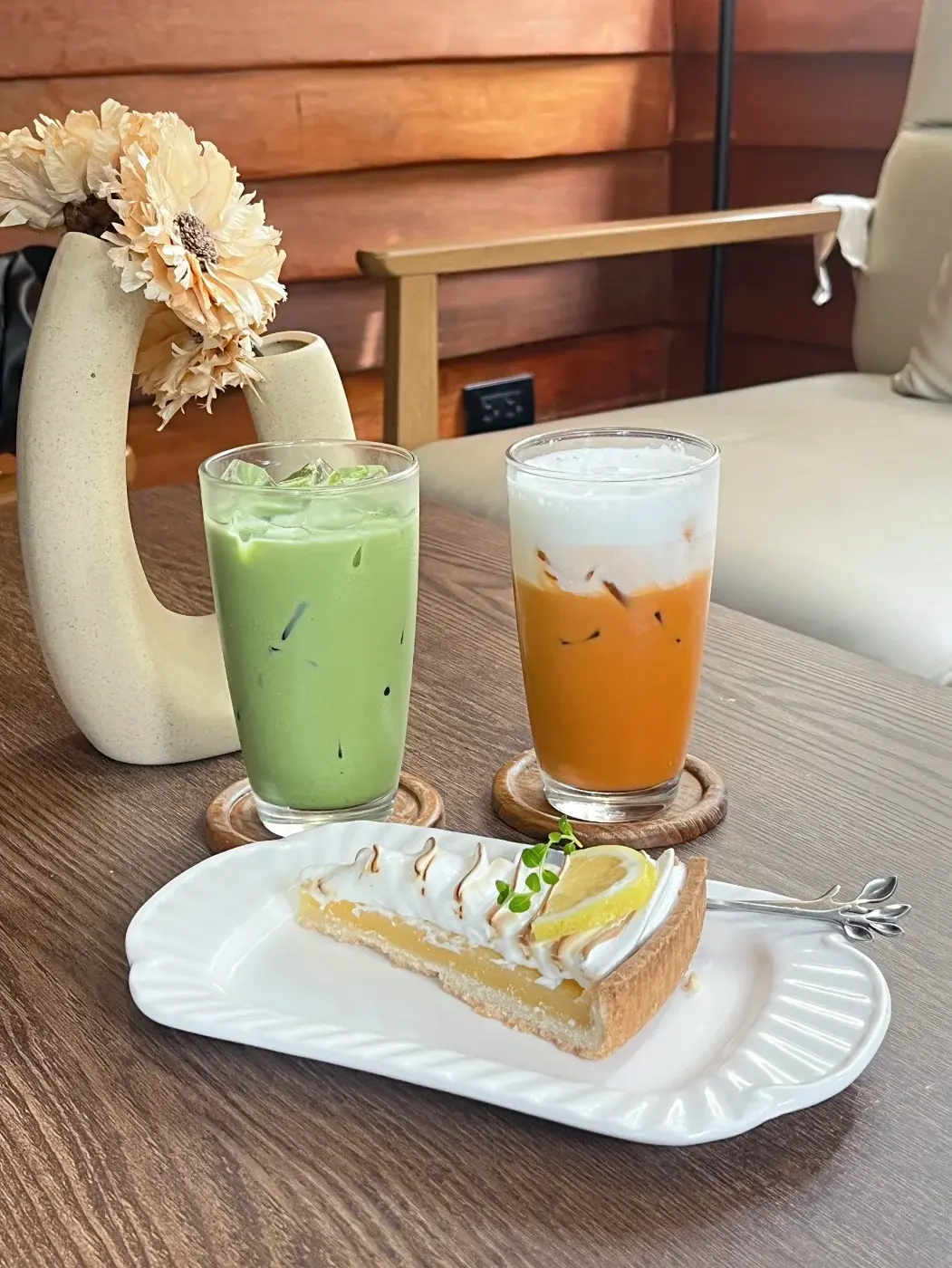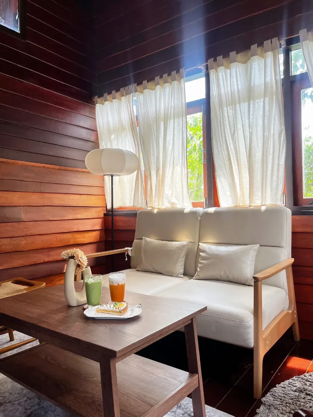 เปิดประตูเข้าไปในบ้านหลังนั้นด้านขวาจะมีที่นั่ง ด้านหน้าจะเป็นโต๊ะนั่ง เรียงๆ กัน ด้านซ้ายมือเป็นเคาเตอร์ชงกาแฟ เครื่องดื่ม รวมถึง ขนมต่างๆ คือบรรยากาศดีอ่ะ เราก็เดินเข้าไปที่เคาเตอร์สั่ง เครื่องดื่มกับเพื่อนคนละแก้ว เราสั่งชาไทย เพื่อนสั่ง ชาเขียว และขนมเค้กก็เลือก เป็น เหมือนทาร์ต เลม่อนอ่ะ หน้าตาน่ากินดี