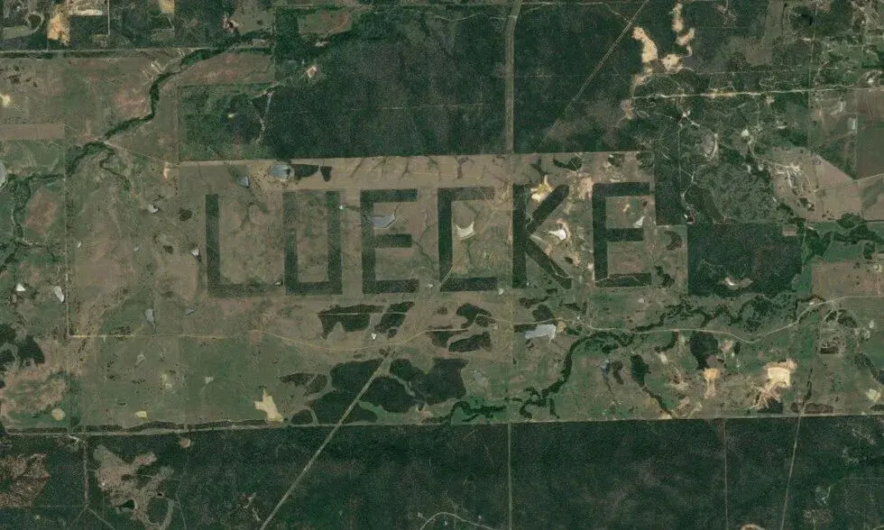 เขานำรถไถออกไปเคลียร์ป่าบริเวณหนึ่ง แล้วค่อยๆ ไถทิ้งให้กลายเป็นตัวอักษรยักษ์คำว่า "LUECKE" ซึ่งก็คือนามสกุลของเขาเอง! ตัวอักษรเหล่านั้นมีความสูงระดับ "กิโลเมตร" และกินพื้นที่ยาวกว่า 2.5 ไมล์ (ประมาณ 4 กิโลเมตร) กลายเป็นลายเซ็นที่ใหญ่ที่สุดในประวัติศาสตร์มนุษยชาติ!
