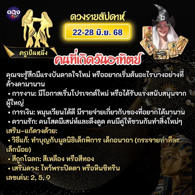 คนที่เกิดวันอาทิตย์ คุณจะรู้สึกมีแรงบันดาลใจใหม่ หรืออยากเริ่มต้นอะไรบางอย่างที่ค้างคามานาน • การงาน: มีโอกาสเริ่มโปรเจกต์ใหม่ หรือได้รับแรงสนับสนุนจากผู้ใหญ่ • การเงิน: หมุนเวียนได้ดี มีรายจ่ายเกี่ยวกับของที่อยากได้มานาน • ความรัก: คนโสดมีเสน่ห์และดึงดูด คนมีคู่ให้ชวนกันทำสิ่งใหม่ๆ