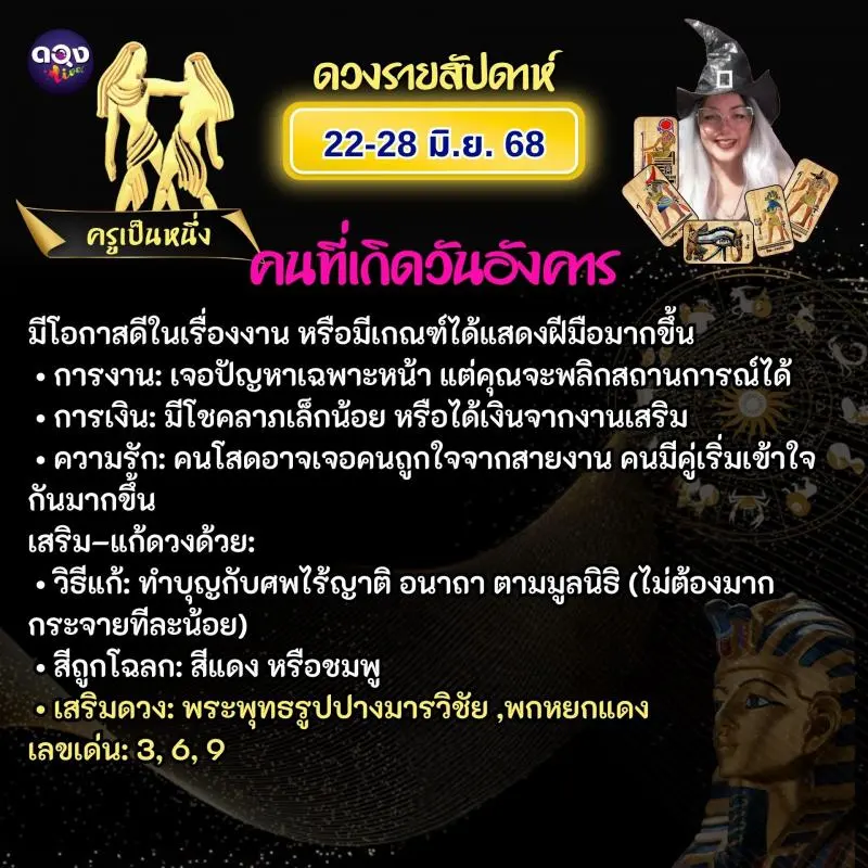 คนที่เกิดวันอังคาร มีโอกาสดีในเรื่องงาน หรือมีเกณฑ์ได้แสดงฝีมือมากขึ้น • การงาน: เจอปัญหาเฉพาะหน้า แต่คุณจะพลิกสถานการณ์ได้ • การเงิน: มีโชคลาภเล็กน้อย หรือได้เงินจากงานเสริม • ความรัก: คนโสดอาจเจอคนถูกใจจากสายงาน คนมีคู่เริ่มเข้าใจกันมากขึ้น