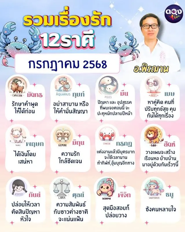 รวมเรื่องรัก 12 ราศี ทำนายเดือน กรกฎาคม 2568 by อ.พิรฌาน