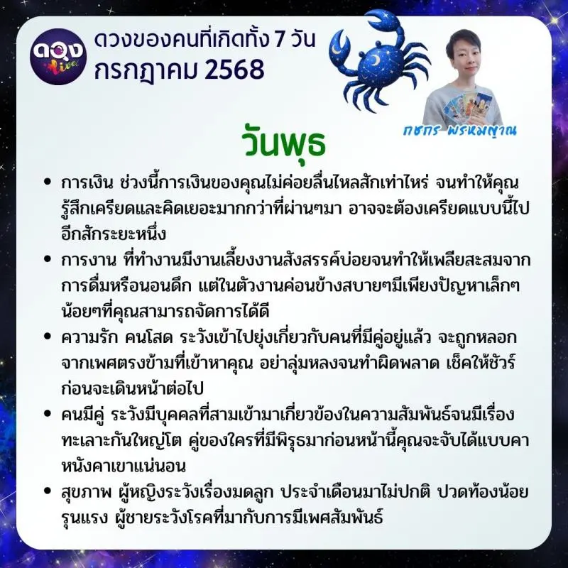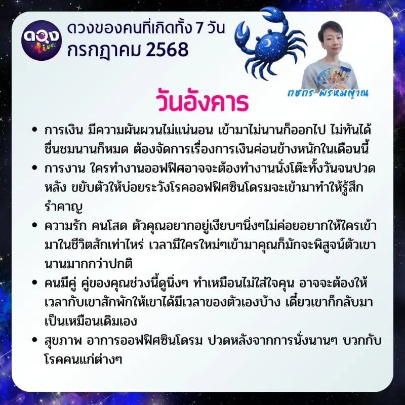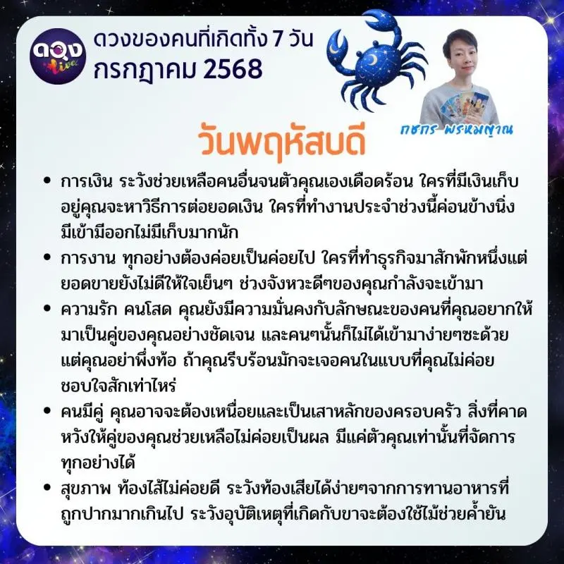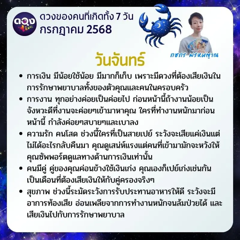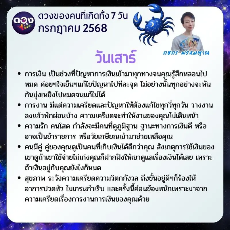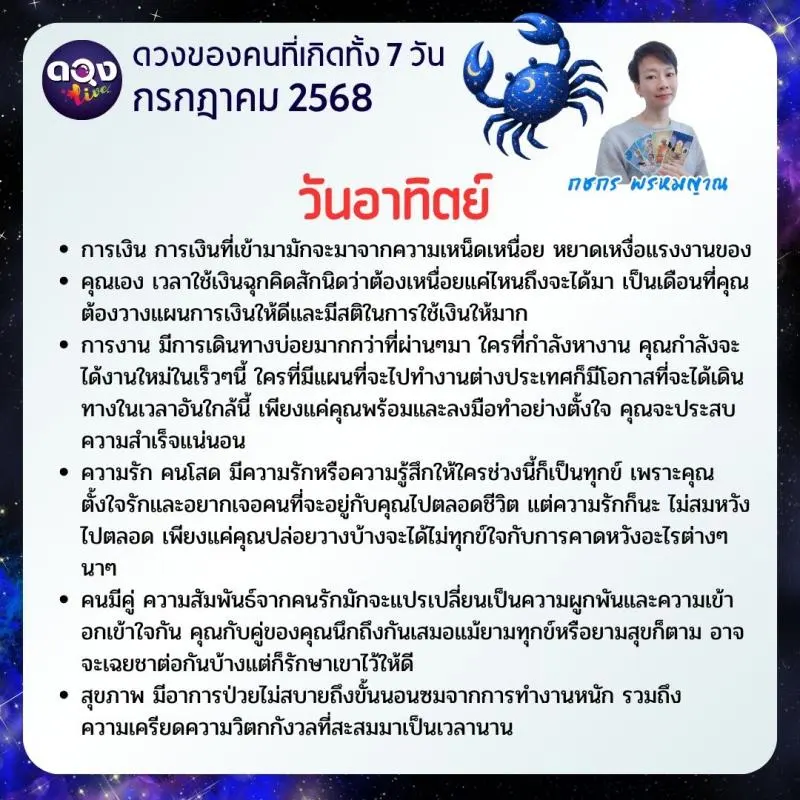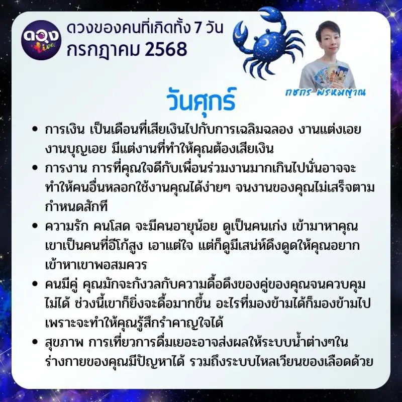 ดวงของคนที่เกิดทั้ง 7 วัน เดือนกรกฎาคม 2568 by กชกร พรหมญาณ