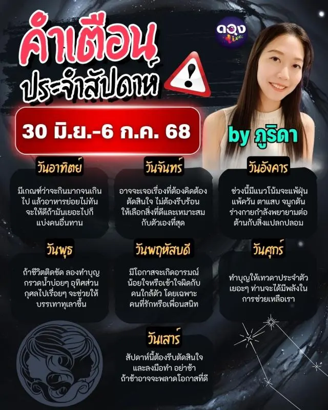 คำเตือนประจำสัปดาห์ 30 มิ.ย. - 6 ก.ค. 68 by อ.ภูริดา