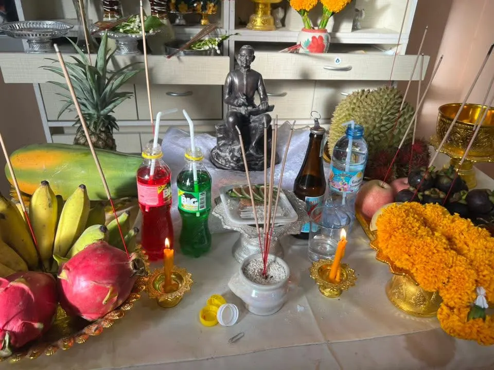 พวงมาลัยดอกดาวเรือง เชื่อในความรุ่งเรือง เหล้าขาวยังต้องเสริมสิ่งที่ต้องเติมห้ามขาดครัน วางไว้พร้อมน้ำเปล่า คู่กันเราส่องวิถี บวงสรวงพร้อมทุกอย่างมี เริ่มปักสีธูปเทียนทอง