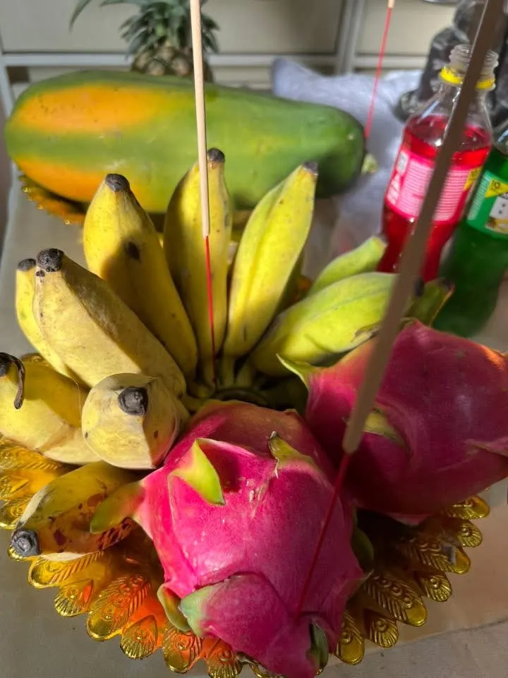 กล้วยน้ำหว้าสอง แก้วมังกรทองอันสดสวย ธูปตั้งสิ่งของด้วย งามสดสวยไม่อย่างละหน่อย