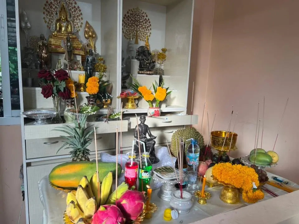 ในบ้านเรานั้นมีความศรัทธาที่มากมาย ด้านบนนั้นจะเป็นการไหว้พระ การจัดวาง พระพุทธรูปจะอยู่ด้านบน พระพิฆเนศเคียงข้าง แต่แยก ไหว้พระก่อน วางดอกไม้จุดธูปเทียนบูชาพระรัตนตรัยตามด้วย นำสุนทรภู่ไว้ด้านล่าง วางผลไม้หลายอย่างตามที่ประสงค์ เมื่อไหว้พระพุทธคุณ ธรรมคุณ สังฆคุณเสร็จแล้ว จึงลงมาไหว้ต่อ การปักธูปนั้นคือการถวาย