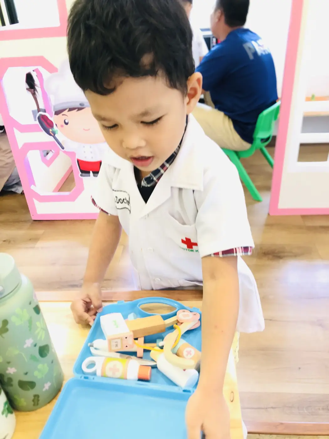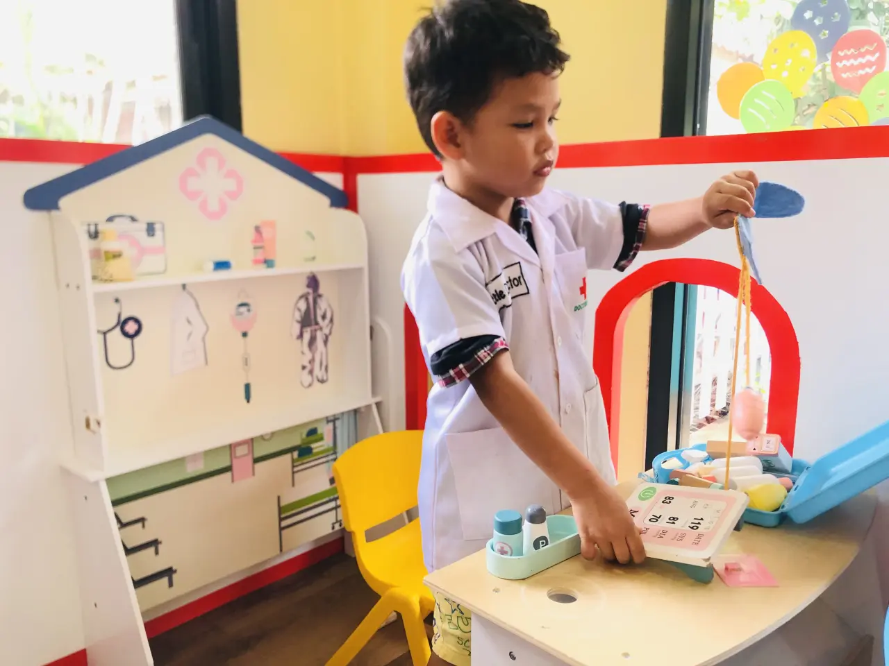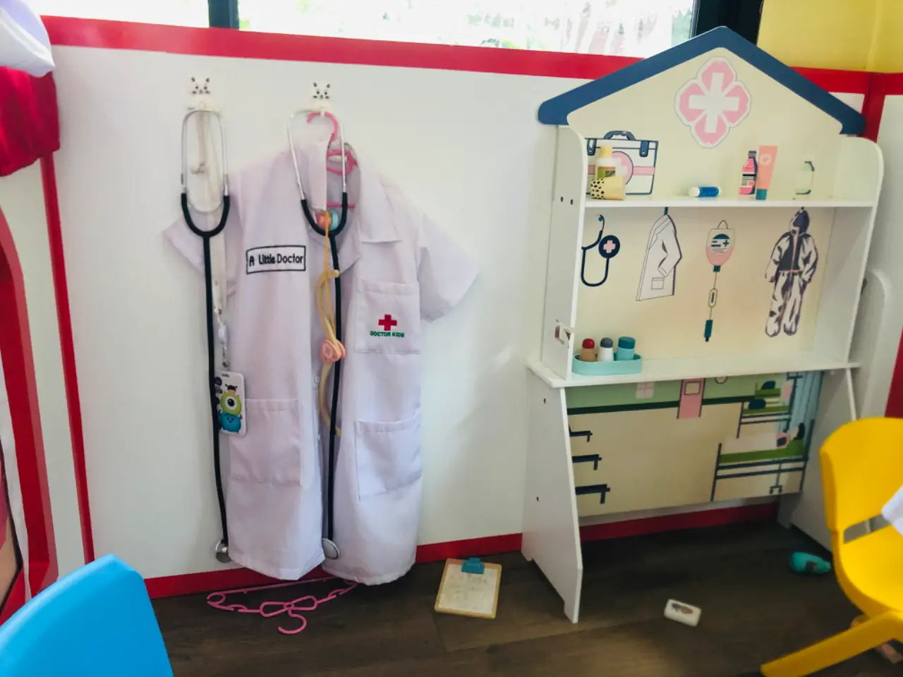 พอเข้าไปสิ่งแรกที่จะเห็นคือชุด เด็กๆจะรู้ว่าการจะเป็นหมอนั้นจะต้องใส่ชุดของคุณหมอที่มีสีขาว มีเครื่องหมายกาชาดในหน้าอก เมื่อเป็นคุณหมอจะต้องมีอุปกรณ์ในการรักษาคือ หูฟังบ้าง หรือสิ่งของที่ใช้ในการรักษา