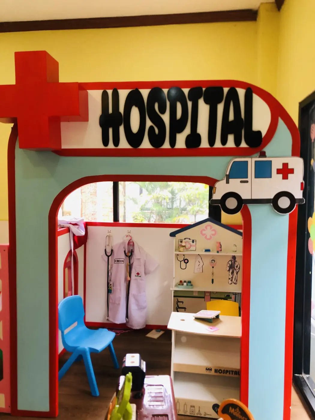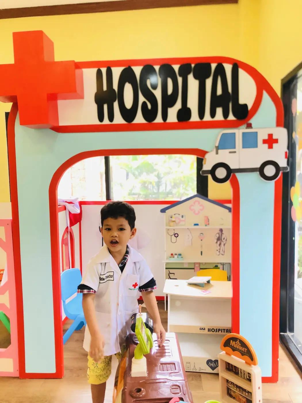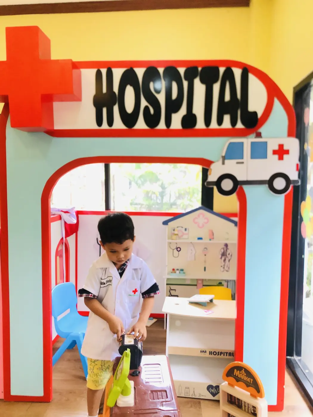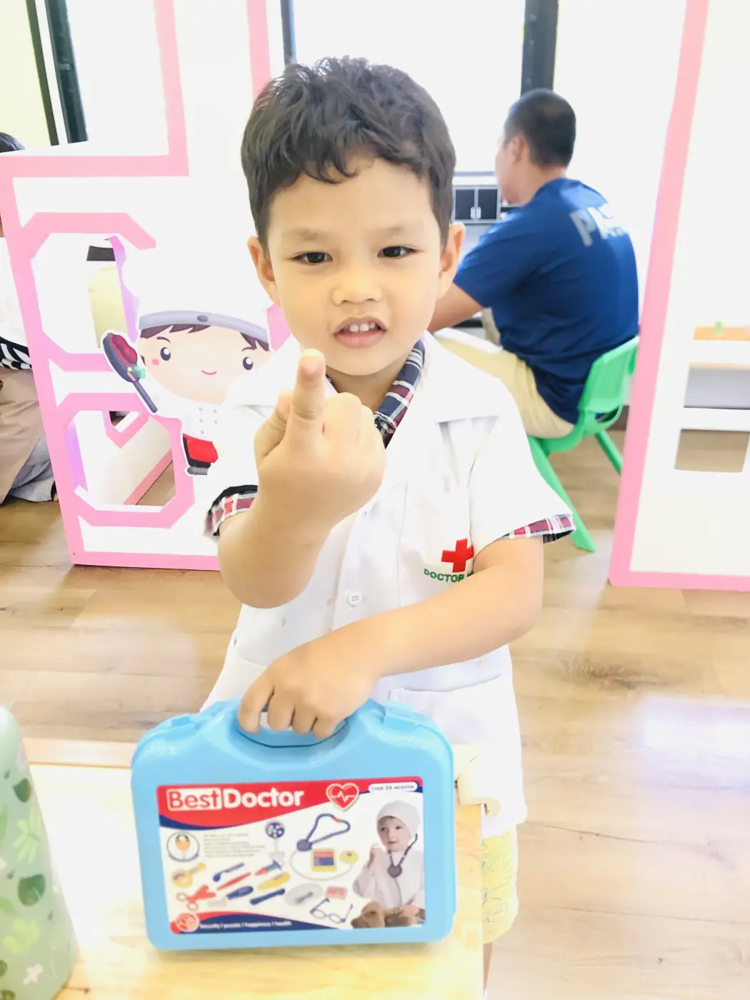พอเข้าไปสิ่งแรกที่จะเห็นคือชุด เด็กๆจะรู้ว่าการจะเป็นหมอนั้นจะต้องใส่ชุดของคุณหมอที่มีสีขาว มีเครื่องหมายกาชาดในหน้าอก เมื่อเป็นคุณหมอจะต้องมีอุปกรณ์ในการรักษาคือ หูฟังบ้าง หรือสิ่งของที่ใช้ในการรักษา