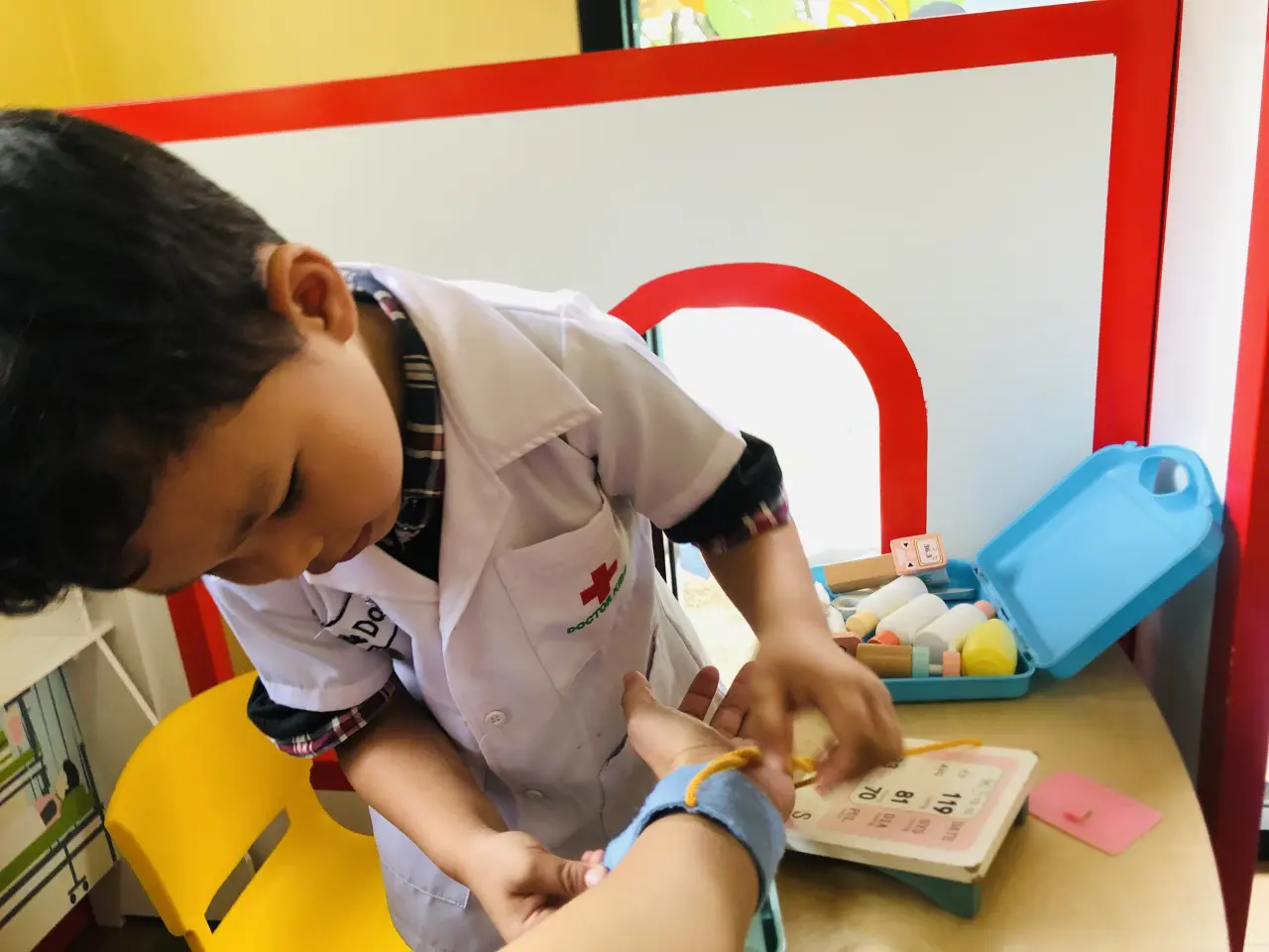 กระเป๋ารักษา กล่องที่ใส่ครบทุกอย่าง มียา มีเข็มฉีดยา แอลกอฮอล์ หรือเครื่องสำหรับการวัดอุณหภูมิ มีทั้งวัดแบบแตะหน้าผากหรือใช้ในการวัดบริเวณขาหนีบ วัดคลื่นหัวใจ การหยิบและฝึกในเรื่องของการเก็บ เขาจะต้องรู้ว่าเมื่อเรานั้นใช้แล้วจะต้องเก็บอย่างไรให้กล่องนั้นสามารถที่จะปิดได้