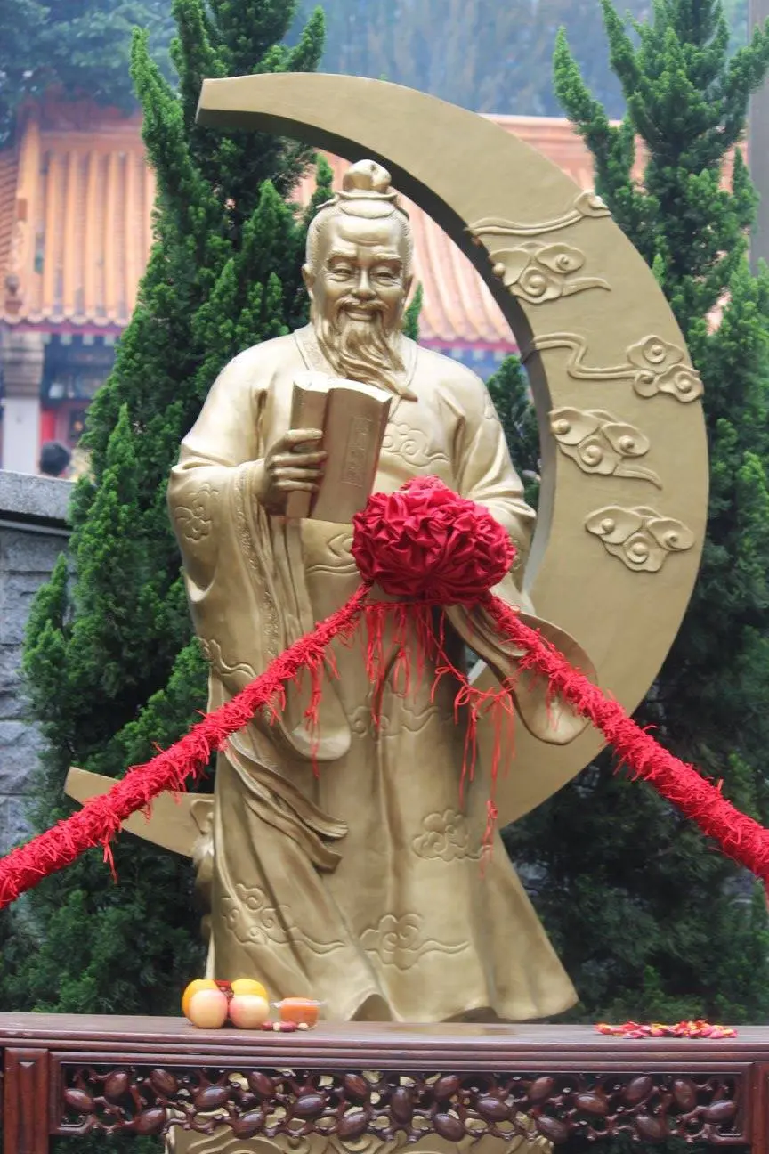 ตรงนี้คือรูปปั้น มีพระจันทร์เสี้ยวอยู่เบื้องหลัง เมื่อซ้ายนั้นถือในส่วนของสมุดบัญชีรายชื่อหนุ่มสาวที่จะได้รับคำอวยพร ส่วนในมือขวานั้นจับในส่วนของ ปมด้ายสีแดงซึ่งมีการผูกโยงระหว่างผู้ชายและหญิงที่กำลังจะเข้าพิธีแต่งงาน