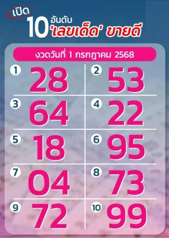 มาแล้ว! เปิด 10 อันดับเลขเด็ดขายดี งวดวันที่ 1 กรกฎาคม 68..รีบส่องเลย รวยแน่นอน!!