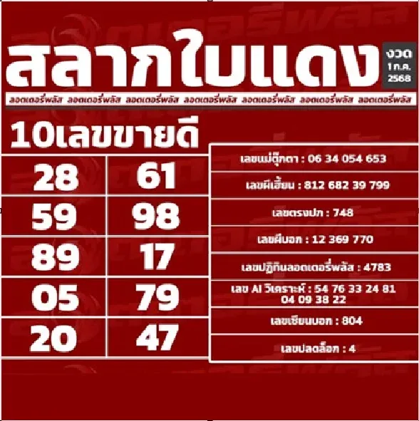 10 เลขเด็ด "สลากใบแดง" ให้โชคแล้ว! งวดวันที่ 1 กรกฎาคม 68..วันนี้รวย รีบส่องเลย!!