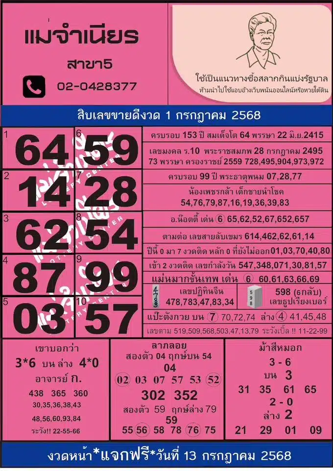 เดินทางมาถึงวันที่สลากกินเเบ่งรัฐบาลไทยจะออกรางวัลในวันที่ 1 กรกฎาคม 2568 งานนี้คอหวบท่านใดยังไม่มีเลขในดวงใจเเล้วนั้นไม่เป็นไร เพราะว่าพวกเราได้ไปรวบรวมเลขเด็ดน่าสนใจ มาจากเจ้าเเม่ใบหวยชื่อดังที่คอหวยพากันติดตาม นั้นก็คือ หวยเเม่จำเนียร หรือหวยใบสีชมพู