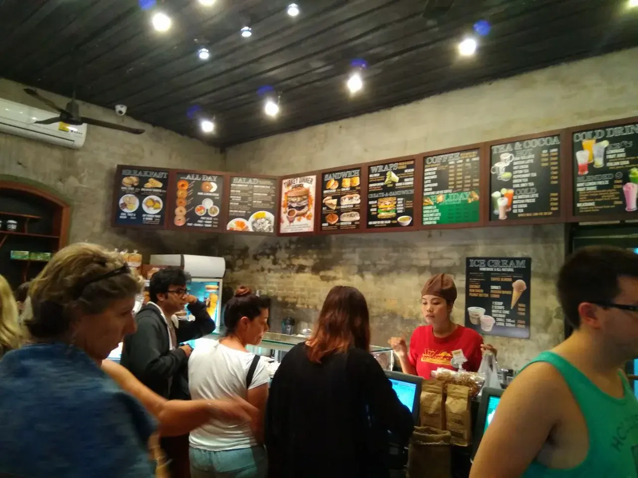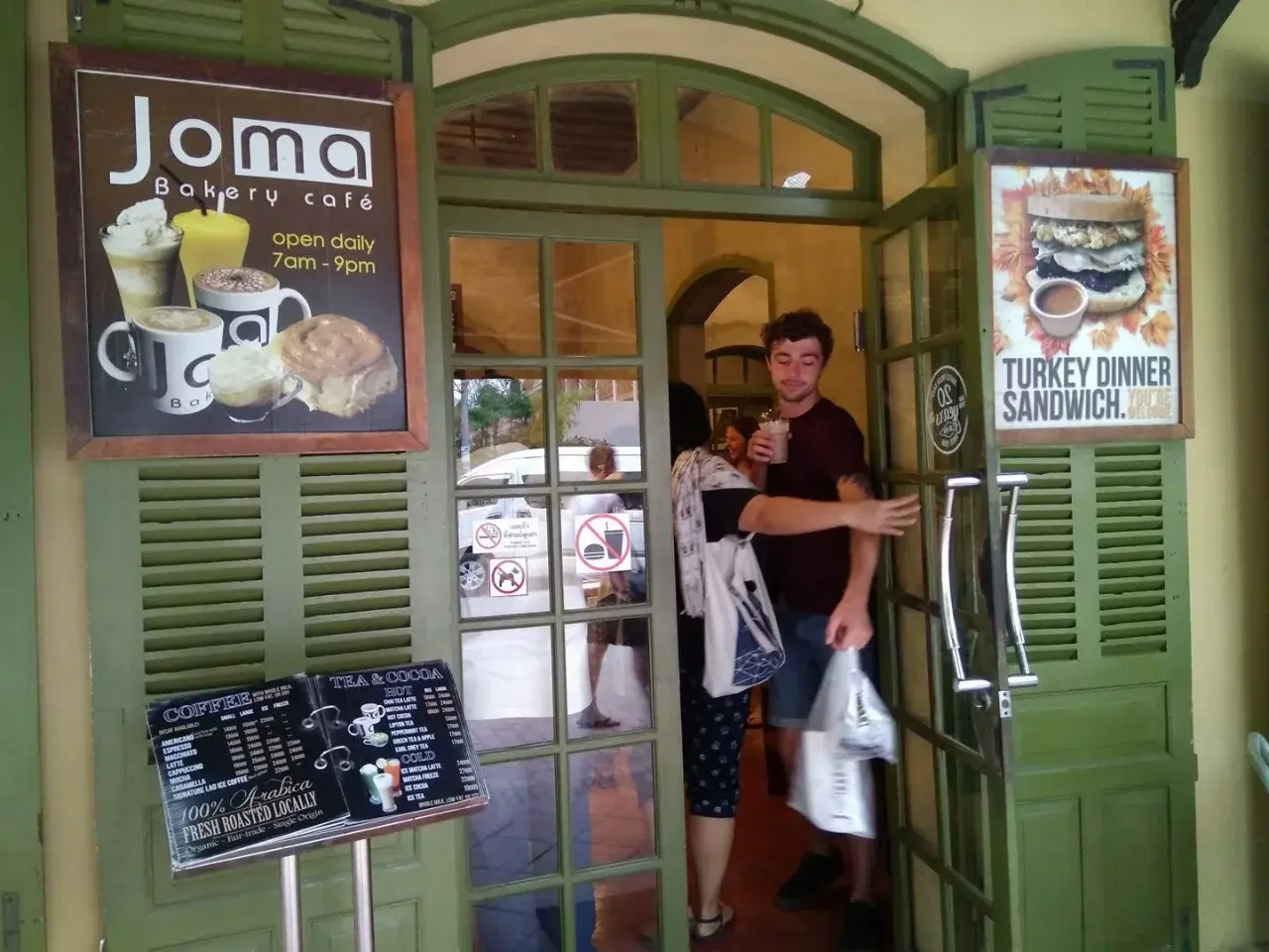 ในร้านนั้นเมื่อเราเดินเข้าไปเหมือนว่าอยู่ที่ยุโรป ในหลวงพระบางนั้นร้านอาหารที่จะทานในตอนเช้านั้นเปิดช้ามากอย่างน้อยคือ สิบนาฬิกาก่อนหน้านั้นมีบ้างแต่หาทานได้ยาก ส่วนมากคนที่ตื่นเช้าจะไปซุปเปอร์มาเก็ต แต่ร้านกาแฟนี้ตื่นแต่เช้าจึงเต็มด้วยคนจำนวนมาก จนไม่สามารถที่จะเดินเข้าร้านแล้วไปสั่งของได้ง่าย ต้องรอคิวมากกว่าสิบนาทีด้านนอกเพราะยังเข้าไม่ได้