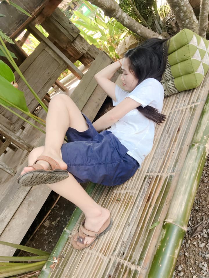 หลังจากที่เก็บของนั้นเสร็จ เราสามารถที่จะมานั่งหรือนอนเล่นแคร่ด้านล่าง หมอนใบใหญ่นั่งพิงคุยกันกับเพื่อนเพราะว่าบริเวณนี้นั้นมีมากกว่าห้าอันนั่งแล้วเย็นมาก