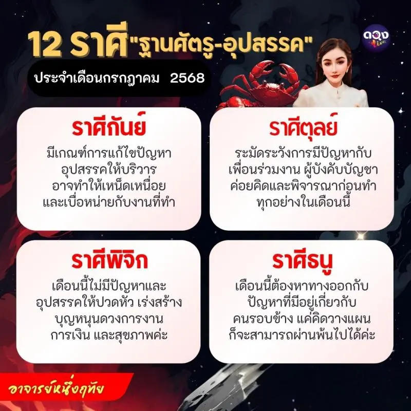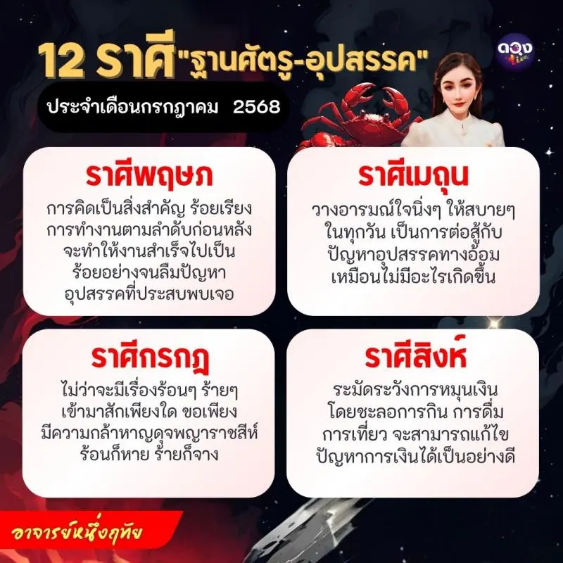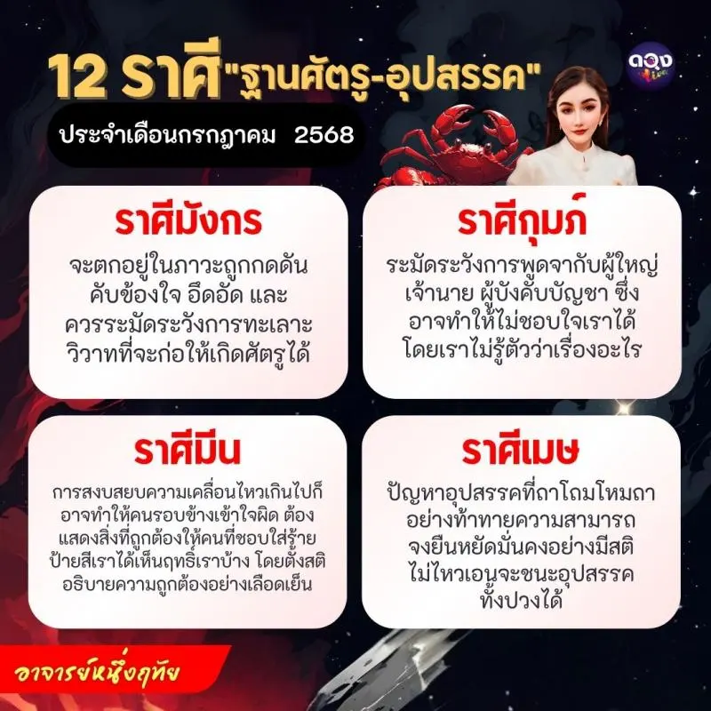 ฐานดวงศัตรู-อุปสรรค 12 ราศี ประจำเดือนกรกฎาคม 2568 พยากรณ์โดย อาจารย์หนึ่งฤทัย