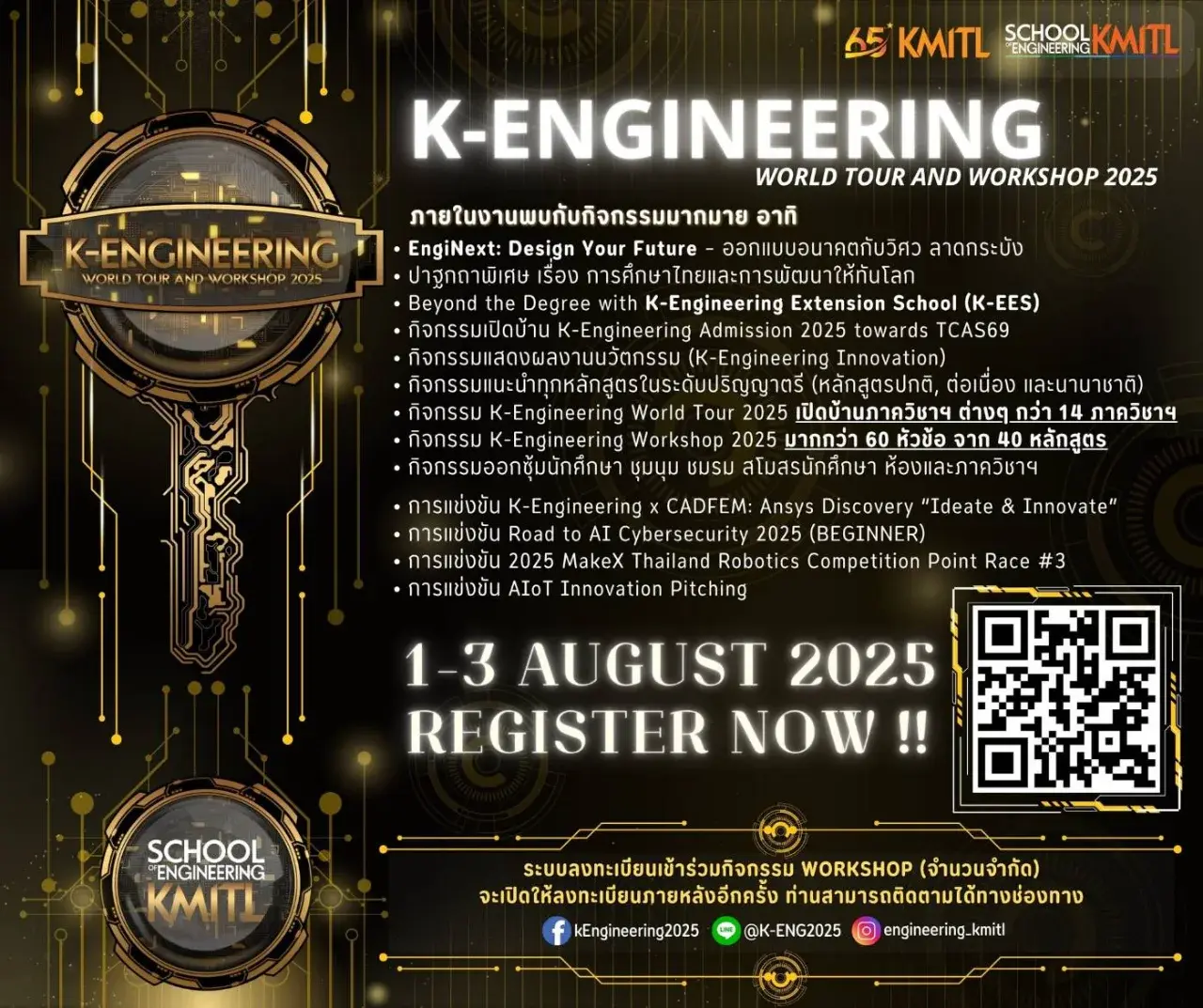 “สจล.” เปิดบ้านจัดใหญ่ K-ENGINEERING WORLD TOUR AND WORKSHOP 2025 ครั้งที่ 7 ด้วยเวิร์กช็อปด้านวิศวกรรมครบทุกมิติ ใหญ่ที่สุดในไทย จุดประกายเยาวชนสู่เส้นทางวิศวกรระดับโลก ในยุคที่เทคโนโลยีก้าวกระโดดและนวัตกรรมเป็นพลังขับเคลื่อนเศรษฐกิจโลก การเตรียมกำลังคนด้านวิศวกรรมจึงมีความสำคัญอย่างยิ่ง โดยเฉพาะในประเทศไทยที่กำลังมุ่งสู่สังคมเทคโนโลยีขั้นสูง ล่าสุด คณะวิศวกรรมศาสตร์ สถาบันเทคโนโลยีพระจอมเกล้าเจ้าคุณทหารลาดกระบัง (สจล.) เตรียมจัดงาน K-ENGINEERING WORLD TOUR AND WORKSHOP 2025 ขึ้นระหว่างวันที่ 1–3 สิงหาคม 2568 ณ วิทยาเขตลาดกระบัง งานนี้นับเป็นการจัดขึ้นเป็นปีที่ 7 และได้รับการยอมรับว่าเป็น “งานเวิร์กช็อปด้านวิศวกรรมที่ใหญ่ที่สุดในประเทศไทย”