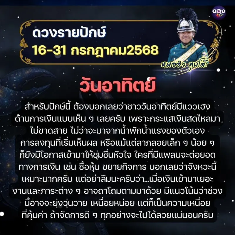 วันอาทิตย์ สำหรับปักษ์นี้ ต้องบอกเลยว่าชาววันอาทิตย์มีแววเฮงด้านการเงินแบบเห็นๆ เลยครับ เพราะกระแสเงินสดไหลมาไม่ขาดสาย ไม่ว่าจะมาจากน้ำพักน้ำแรงของตัวเอง การลงทุนที่เริ่มเห็นผล หรือแม้แต่ลาภลอยเล็กๆ น้อยๆ ก็ยังมีโอกาสเข้ามาให้ชุ่มชื่นหัวใจ ใครที่มีแพลนจะต่อยอดทางการเงิน เช่น ซื้อหุ้น ขยายกิจการ บอกเลยว่าจังหวะนี้เหมาะมากครับ แต่อย่าลืมนะครับว่า...เมื่อเงินเข้ามาเยอะ งานและภาระต่างๆ อาจถาโถมตามมาด้วย มีแนวโน้มว่าช่วงนี้อาจจะยุ่งวุ่นวาย เหนื่อยหน่อย แต่ก็เป็นความเหนื่อยที่คุ้มค่า ถ้าจัดการดีๆ ทุกอย่างจะไปได้สวยแน่นอนครับ