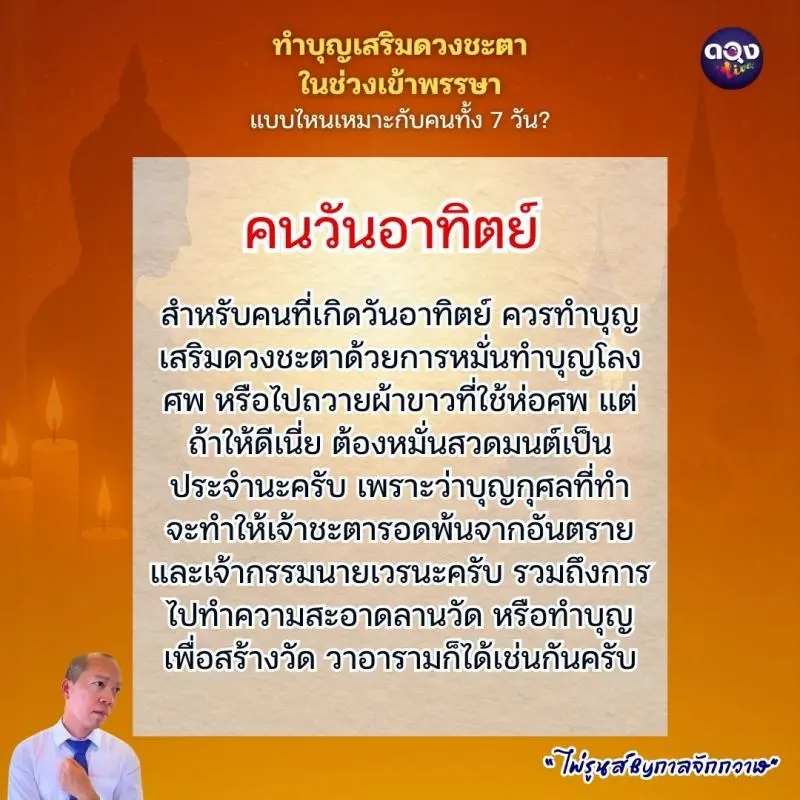 คนวันอาทิตย์ สำหรับคนที่เกิดวันอาทิตย์ ควรทำบุญเสริมดวงชะตาด้วยการหมั่นทำบุญโลงศพ หรือไปถวายผ้าขาวที่ใช้ห่อศพ แต่ถ้าให้ดีเนี่ย ต้องหมั่นสวดมนต์เป็นประจำนะครับ เพราะว่าบุญกุศลที่ทำ จะทำให้เจ้าชะตารอดพ้นจากอันตรายและเจ้ากรรมนายเวรนะครับ รวมถึงการไปทำความสะอาดลานวัด หรือทำบุญเพื่อสร้างวัด วาอารามก็ได้เช่นกันครับ